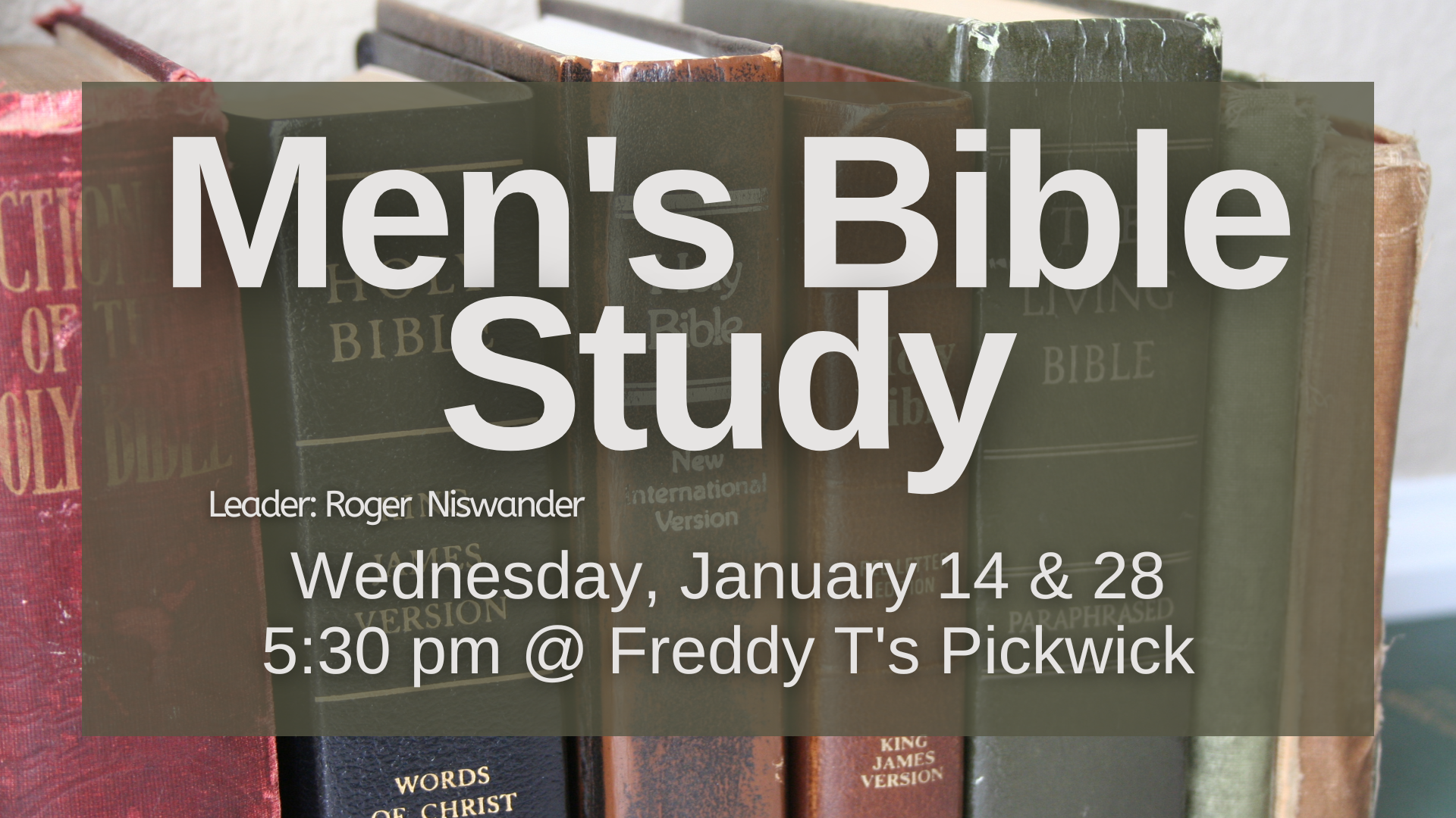 6:00 pm Discipleship Bible Study @ Freddy T’s January 22 @ 6:00 pm Discipleship Bible Study @ Freddy T’s